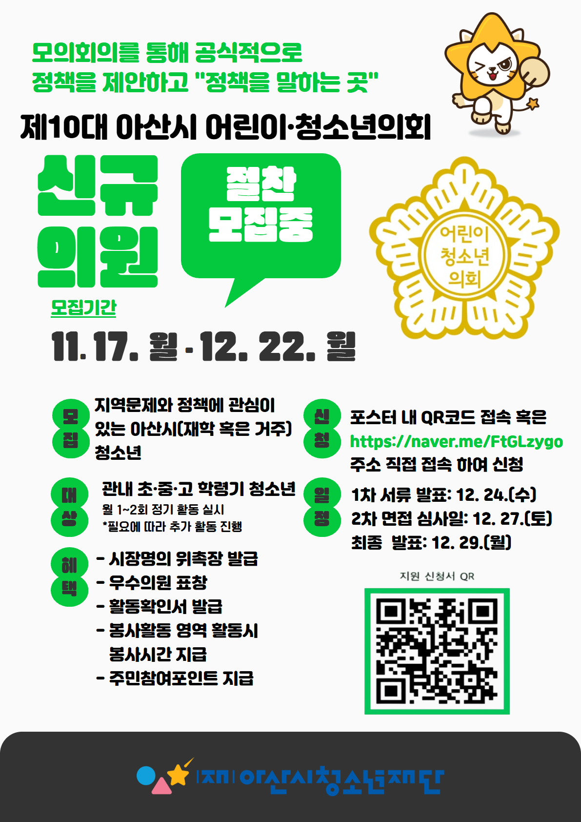 제10대 아산시 어린이·청소년의회 의원을 모집합니다.