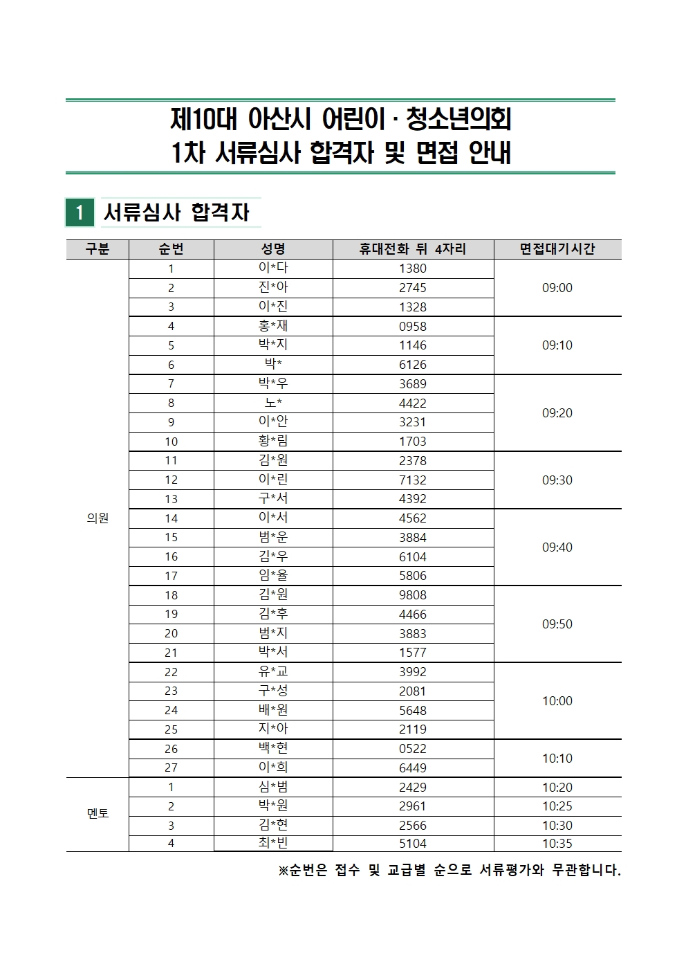 제10대 아산시어린이청소년의회 1차서류심사 결과 및 면접안내